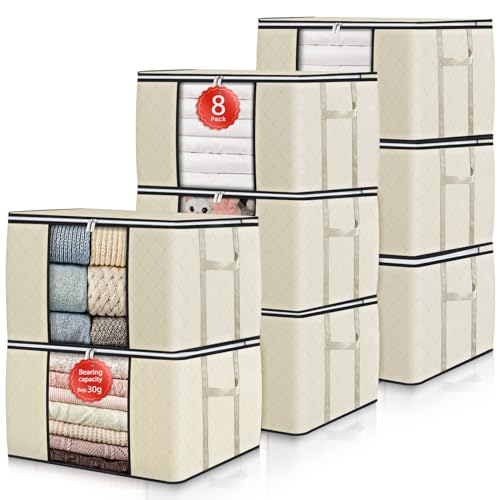 GoMaihe 90 l förvaringsväska, 8 stycken, förvaringslåda med lock, stora förstärkta handtag, kläder flyttlådor för täcken, undersäng, förvaring, garderob, lådor, arrangör beige