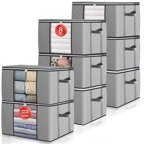GoMaihe 90 l förvaringsväska, 8 stycken, förvaringslåda med lock, stora förstärkta handtag, kläder flyttlådor för täcken, undersäng, förvaring, garderob, lådor, organisering, grå