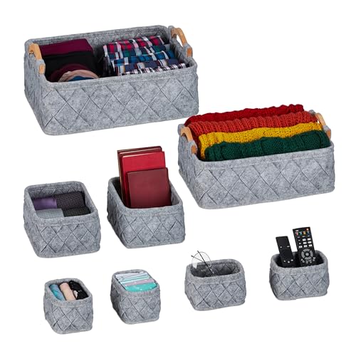 Relaxdays Skåpförvaring, 8-TLG, 4 storlekar, filt, lådor organisationssystem garderob, förvaringslådor, ljusgrå