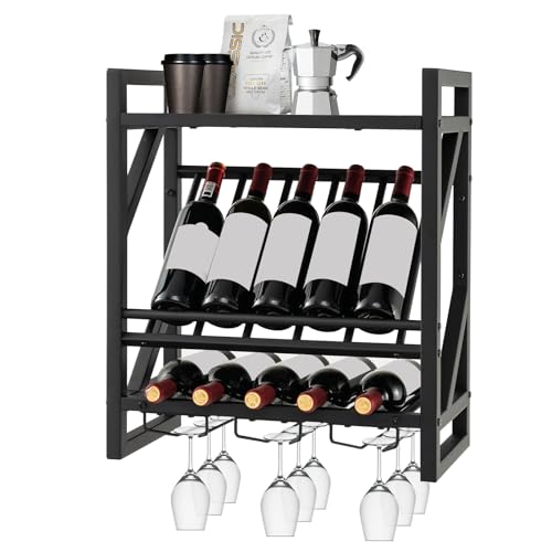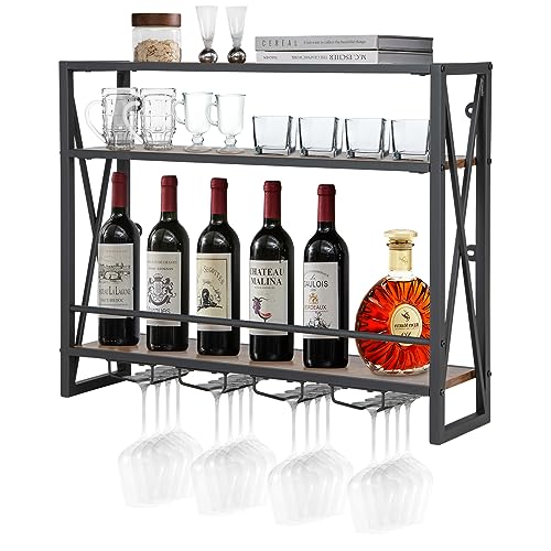 KOMFOTTEU Väggvinställ, dekorativ vinhylla med kopphållare, hängande flaskhållare, 20 kg belastning per lager, för kök, vinkällare, bar (51 x 26,5 x 60 cm)