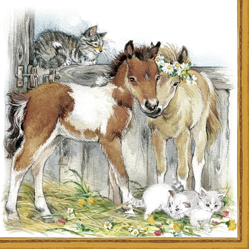 Jubileumshus Tiflair kattunge och föl i stabila lunchservetter 3 lager, paket med 20, för Decoupage 33 x 33 cm, hästar