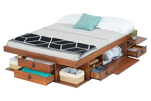 Funktionssäng Bali 140 x 200 karamell – Skåpsäng med gott om lagringsutrymme och lådor, perfekt för små sovrum – säng med förvaring av massivt furuträ – Lådsäng inklusive ribbotten.