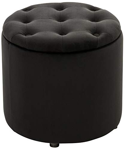 CLP Sittpall, pantinsammet, stoppad pall med lagringsutrymme, quiltad pall med dekorativa knappar, rund pall vadderad, färg: svart