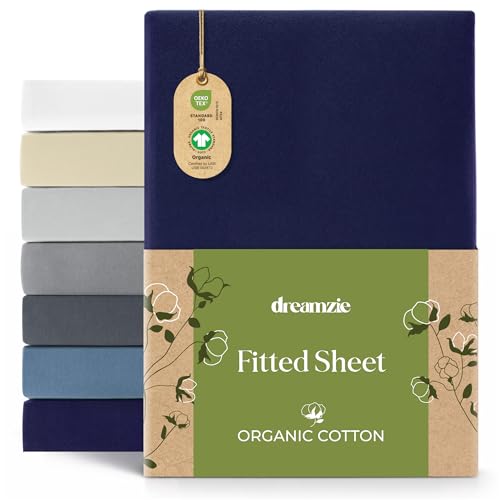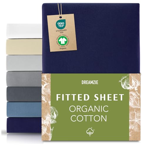 Dreamzie Lakan 180x200 cm - 200x200 cm, 100% ekologisk bomullströja, Madrasshöjd upp till 32 cm, Allergivänlig, Oeko-Tex, Mörkblå
