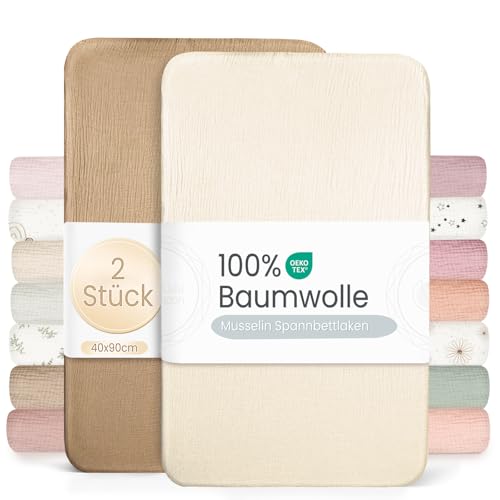lulumoon uppsättning av 2 muslin-bomull dra-på-lakan: barnvagn lakan vagga madrasskydd för barnsäng och sidosäng 90 x 40 cm (grå kräm)