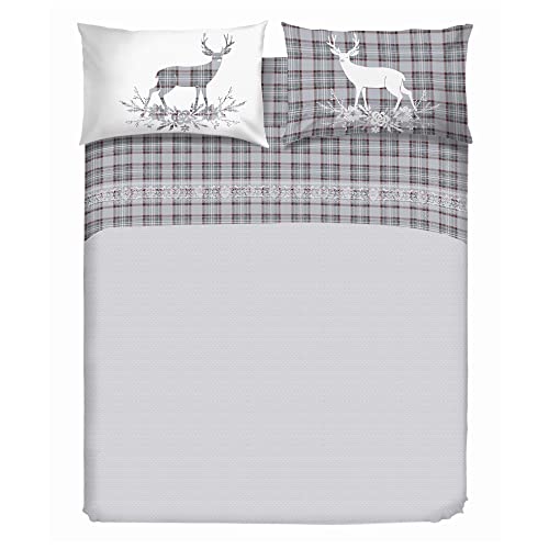 PENSIERI DELICATI Set med dubbelsäng 100% bomull, set med lakan för dubbelsäng 180 x 200 med underlakan, överlakan och 2 örngott, tillverkat i Italien, mönstrat tartan, rådjur grå