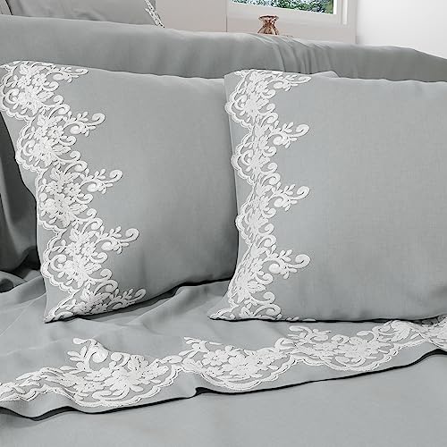 PETTI Artigiani Italiani - Lakan för dubbelsäng med spets, set för dubbelsäng, sängkläder i bomull percale med spets grå 100% Made in Italy