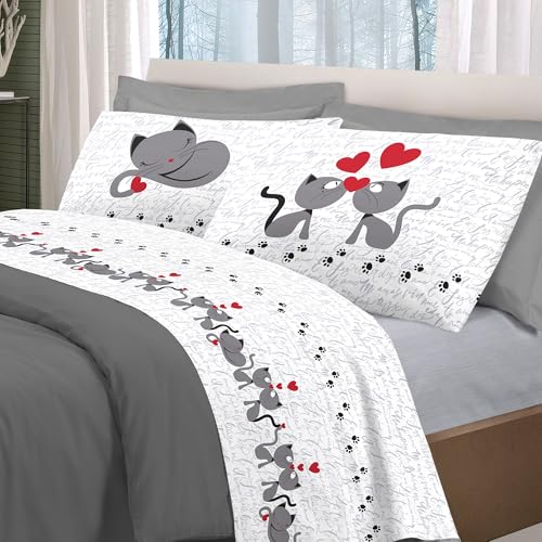 PENSIERI DELICATI Set med dubbelsäng 100% bomull, set med lakan för dubbelsäng 180 x 200 med underlakan, över och 2 örngott, tillverkad i Italien, fantasi kattungar grå
