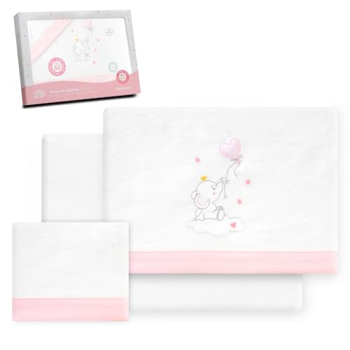 Interbaby Set med lakan spjälsäng 60 x 120% bomull, 100% bomull, flanell, varm, mjuk spjälsäng, med låg filt, bänkskiva och örngott, lämplig för vinter, elefant vit/rosa