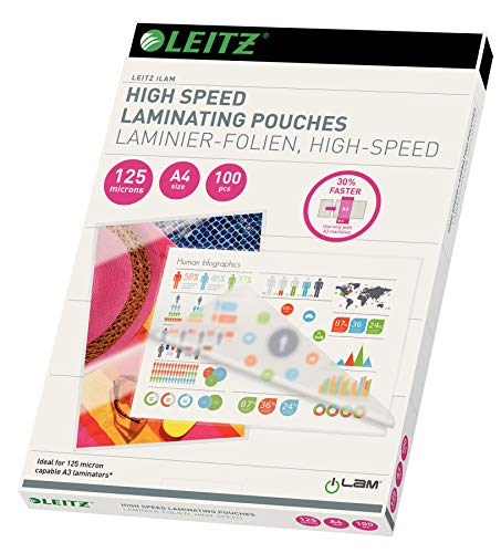 Leitz A4 Speed varmlamineringsfickor, 100-pack, glänsande, transparent, 125 mikron folietjocklek, lamineringsfickor för 30% snabbare laminering, överlägsen kvalitet, 74300002