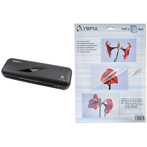 Genie LA 200 laminator inkl. lamineringsfolie (lämplig upp till DIN A4, för 80-125 mic varm laminering) svart, 330 x 106 x 60 mm & Olympia Lamineringsfolier, Genomskinlig, Paket med 100 st
