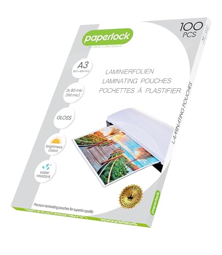 Paperlock Förpackning med 100 stycken A3 80mic lamineringsfickor, transparent glansig finish, förpackningen kan variera