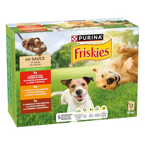 Purina Friskies våtfoder för hund i sås med kyckling, lamm och oxe, 6-pack med 12 kuvert på 85 g