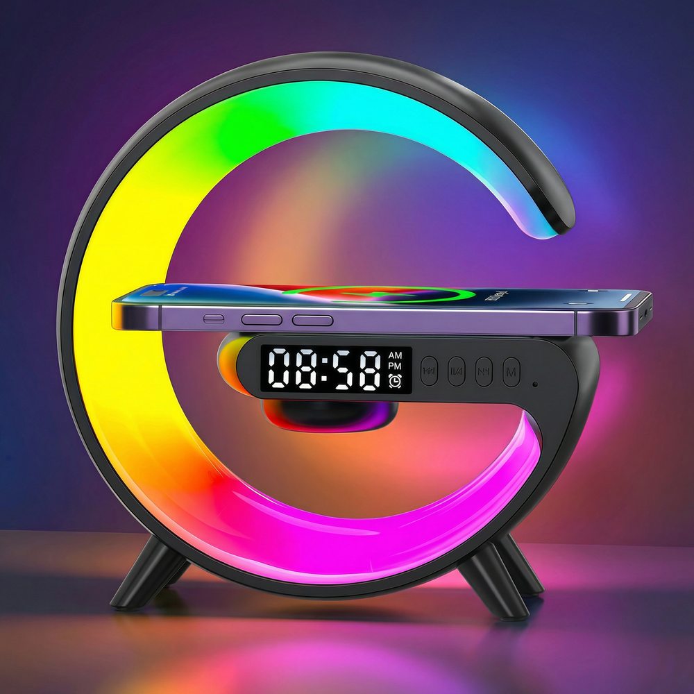 Liten G-formad RGBIC-lampa - Trådlös laddare, 14,5x14cm, Svart, Bluetooth, 5V USB