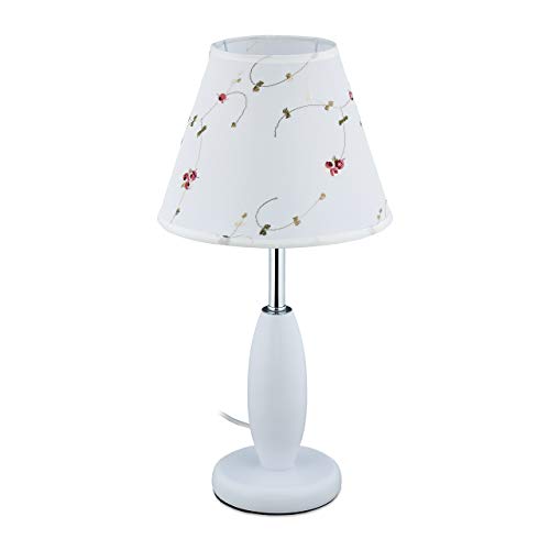 Relaxdays Bordslampa, blomma tygskärm, E27-sockel, vardagsrum, lantlig stil, sänglampa, H x D 45,5 x 23 cm, vit, 10034192