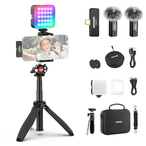 Neewer Vloggingkit för telefon med RGB LED-lampa/Lavalier trådlöst mikrofonsystem/selfiepinne telefonstativ, innehållsskapare nödvändigheter för iPhone Android Podcast YouTube, PA048