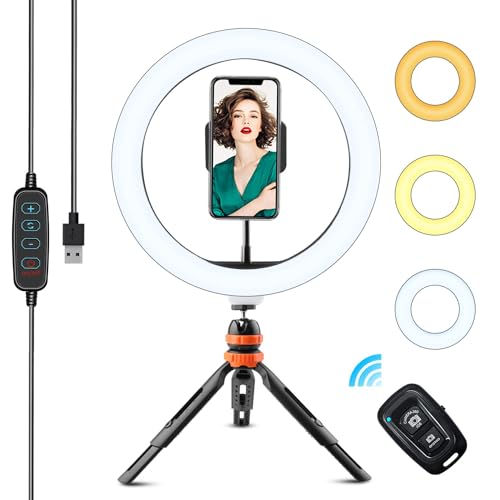 Jubor 25 cm ringljus overhead stativ mobiltelefon, LED ringljus med stativ mobiltelefon dimbar ringlampa videokonferenser lampor 3 ljusfärger + 10 ljusstyrkor för YouTube, selfies, smink, TikTok