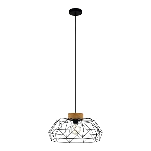 Eglo Pendellampa Padstow, hängande lampa vintage, industriell, retro, hänglampa av stål och trä i svart, natur, matbord, FSC-certifierad, E27-sockel