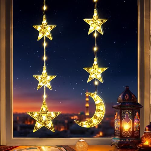 BrizLabs Ramadan dekorativ ljuskedja, 2 stycken Ramadan, måne, stjärnor, fönsterlampor, batteridriven med timer, LED, Eid Mubarak, dekoration, belysning för inomhus, barnrum, bröllop, fest, varmvit