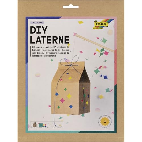 folia 95301 - Gör-det-själv lyktor MILKY WAY, ca 11 x 19,5 x 11 cm – gör-det-själv-lampion pysselset kan utformas som en mjölkkartong med stjärnor, inklusive LED-lampa, 2 batterier och självhäftande