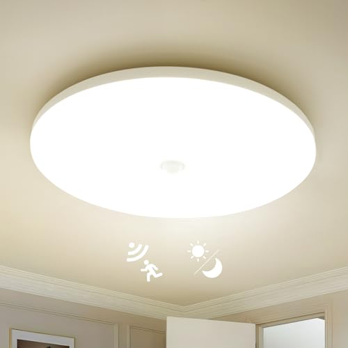 Combuh 18W Taklampa med Rörelsesensor Dold, 1800lm LED-belysning med Dagsljussensor, IP56 Vattentät, 6500K Kallvit, Takpanel för Badrum, Toalett, Hall, Trapphus, Rund Ø30cm