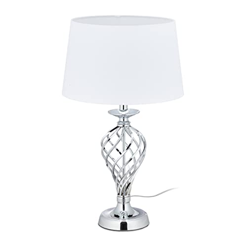 Relaxdays Bord med touch, XL sänglampa, H x D: 61,5 x 36,5 cm, E27, touch-lampa med tygskärm, silver/vit