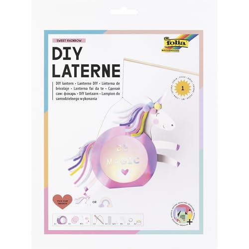 folia 94302 - DIY-lykta Sweet Rainbow, ca 19 x 44 x 6 cm – lykta pysselset kan designas som enhörning eller regnbåge, inklusive LED-lampa, 2 batterier och självhäftande platta