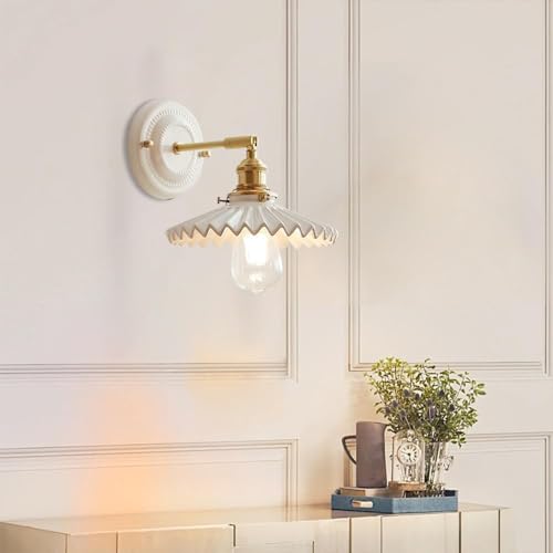BUNCC Japansk stil vintage keramik vägglampa Vit veckad keramisk lampskärm Vägglampa med 180 graders justerbar mässing lampetter Väggmonterad lampa för sängkanten vardagsrum