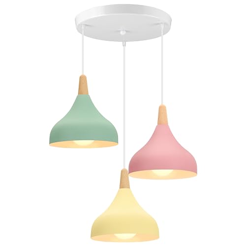 iDEGU 3 lampor hängande lampa retro E27 ljuskrona hängande modern stil dropphatt taklampa metall trä taklampa för matsal vardagsrum kök, Ø 20 cm (grön + rosa + gul, stång)