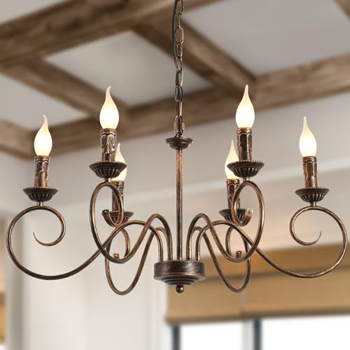 JIINOO Ljuskrona i traditionell lantlig stil, vintage höjdjusterbar järnljusstake, 6 lampor E14 klassisk brons bondgård hängande lampa för kök matsal vardagsrum