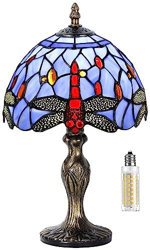 MIAOKE Bordslampa i Tiffany-stil, vintagelampa, lampskärm med handgjord glasmålning, sänglampa för sovrum, arbetsrum, kontor (blå trollslända)