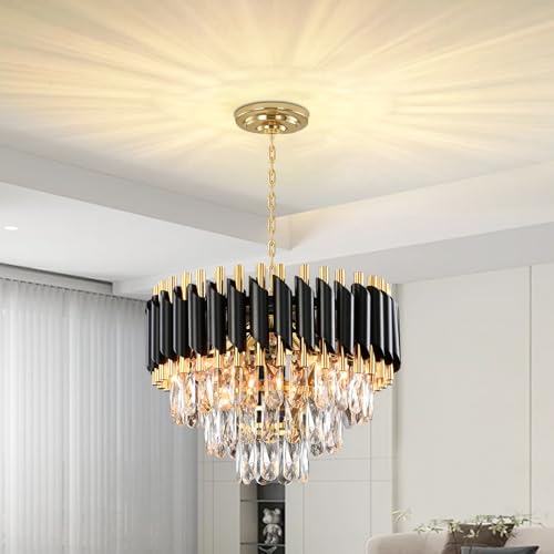 Modern Gyllene Svart Kristallkrona, Runda K9 Kristaller Ljuskronor, E14 Pendellampa Cristal Ljusarmaturer, 3 nivåer ljuskronor lampskärm, justerbar hängande kedja ljuskrona för vardagsrum