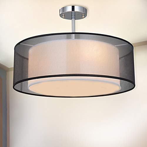 SPARKSOR Taklampa, modern hängande lampskärm, stor svart trumlampskärm, 2 nivåer rund pendellampa, för sovrum vardagsrum, spolning krommatta, 3 glödlampor, E27