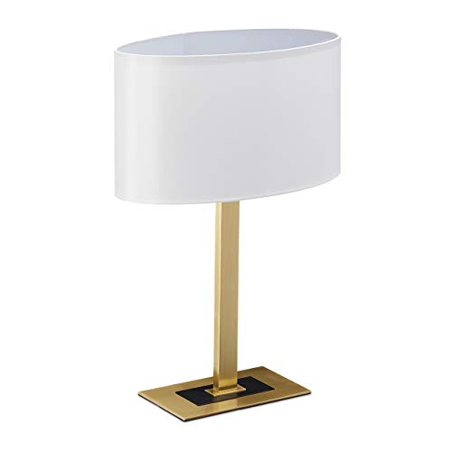 Relaxdays Sänglampa, elegant bord med kabel, E14-fattning, lampskärm oval, 48 x 33 x 19,5 cm, mässing/vit