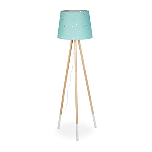 Relaxdays Golvlampa barnrum, E27, med kabel, lampskärm stjärnmotiv, treben, tyg, trä, 147 cm hög, mynta