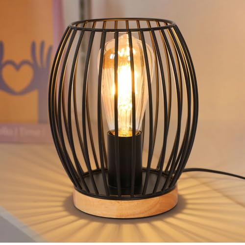 Comely Vintage stil bordslampa för vardagsrum sovrum, industriell retro E27 säng ljus, trä metall bur lampskärm, svart (MAX 60W, utan glödlampa)