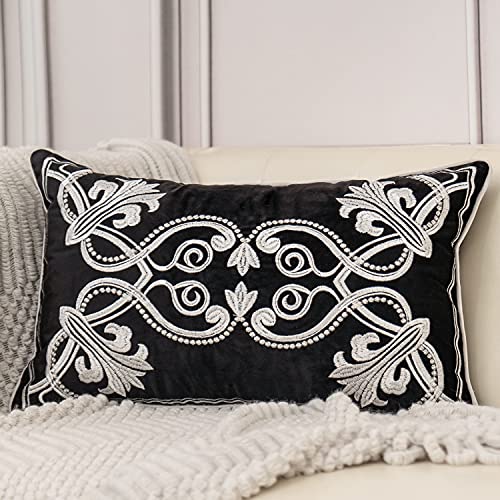 Aeckself europeiskt blommigt kuddöverdrag 30 x 50 cm, lyxig sammet broderad dekorativ ländrygg kuddöverdrag för soffa sovrum vardagsrum, svart och vitt