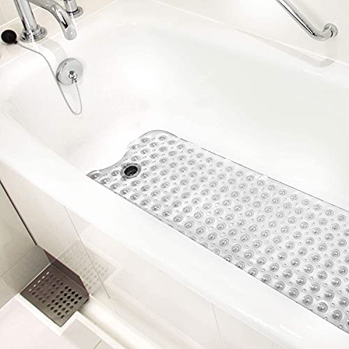 HITSLAM Halkfri badmatta för badkar, 101 x 40 cm extra lång duschmatta anti-mögel, maskintvättbar badrumsmatta med sugkoppar och dräneringshål, mjuk på fötter, vit