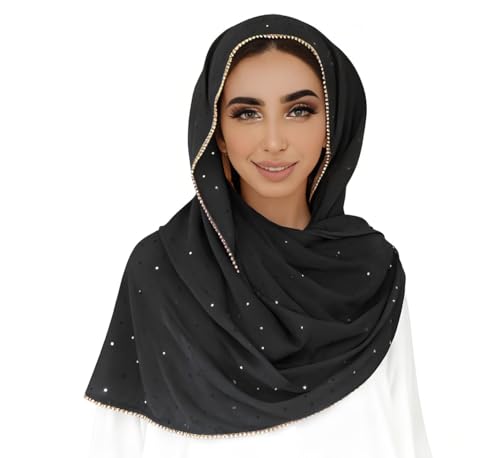 ANKOMINA Dam mjuk chiffong strass lång halsduk sjal mode muslimsk hijab huvudsjal halsdukar, Svart, one size