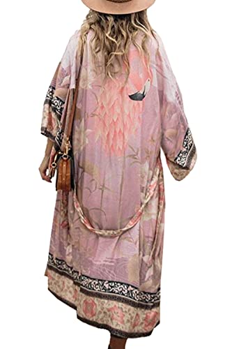 LikeJump Lång blommig kimono morgonrock för kvinnor strand bikini täckande maxiklänning plusstorlek sommarrock, Rosa lila, en storlek