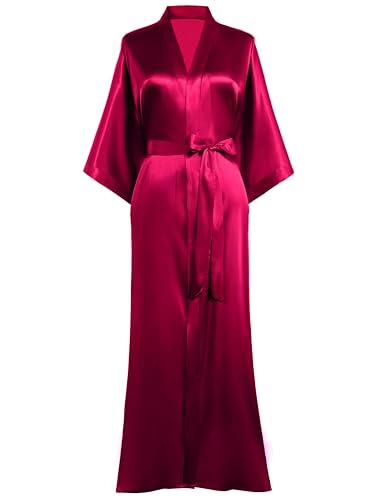 Ledamon Kimono lång morgonrock i 100% siden för kvinnor - klassiska färger och tryck, Rosenröd, one size