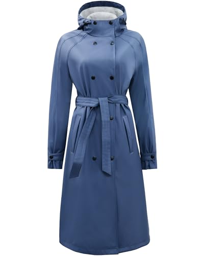 Regnrock dam lång med bälte och huva regnjacka dam vattentät fodrad softshelljacka Friesennerz PU Windbreaker, Dammblå, 44