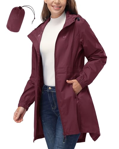 Outdoor Ventures vattentät regnjacka för kvinnor, lång vindjacka övergångsjacka, lätt ventilerande utomhusjacka regnrock, regnparkas med huva, vinröd, XS