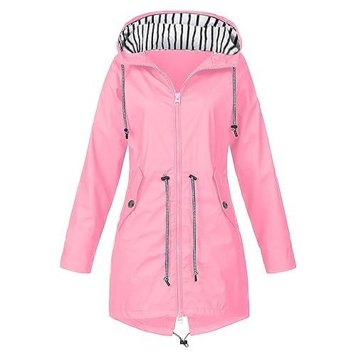 Regnjacka för dam, vattentät, regnrock, höst, övergångsjacka, elegant, lång jacka med huva, lätt, andas, softshelljacka med dragkedja, vindtät utomhusjacka, Rosa-d, XL