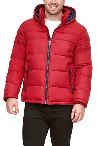 Tommy Hilfiger herr klassisk pufferjacka med huva (standard och stor och lång) dun alternativ ytterkläder rock, Midnatt/vit/röd, XXL tall
