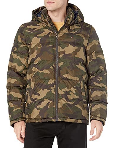 Tommy Hilfiger herr klassisk pufferjacka med huva (standard och stor och lång) dun alternativ ytterkläder rock, Oliv kamouflage, M