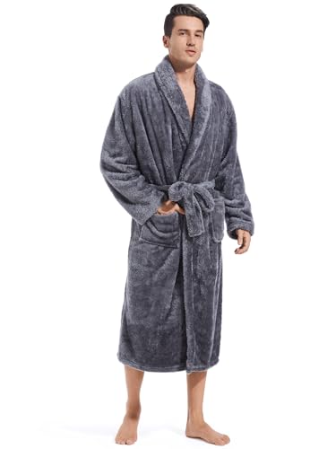 Inre önskan herr plysch fleece rock, mysig varm badrock luddig man spa lång rock med fickor (mörkgrå), Mörkgrått, L-XL