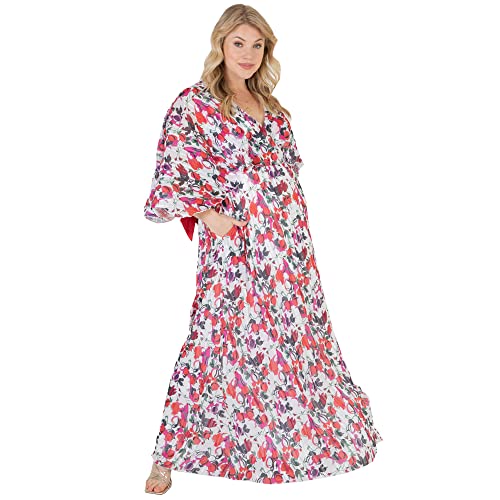 Kvinnors sommar plus size klänningar kurva damer cape ärm v-hals fluga maxi lång längd för bröllop gäst blommönster röd storlek 24, Röd, 50 SE