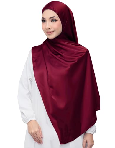 Lina & Lily Lyxig satäng hijab huvudscarf sjal för muslimska kvinnor extra lång, Vinröd, en storlek