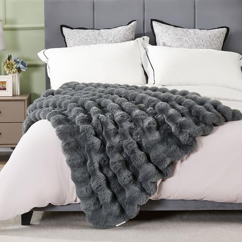 DREAMNINE Mjuk luddig bubbla fuskpäls filt för soffa 127 cm x 152 cm, dubbelsidig lång lurvig tjock varm fluffig filt för vintern, dekorativ lyxig grå mysig plysch söt lurvig filt, grå